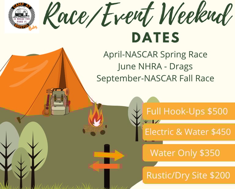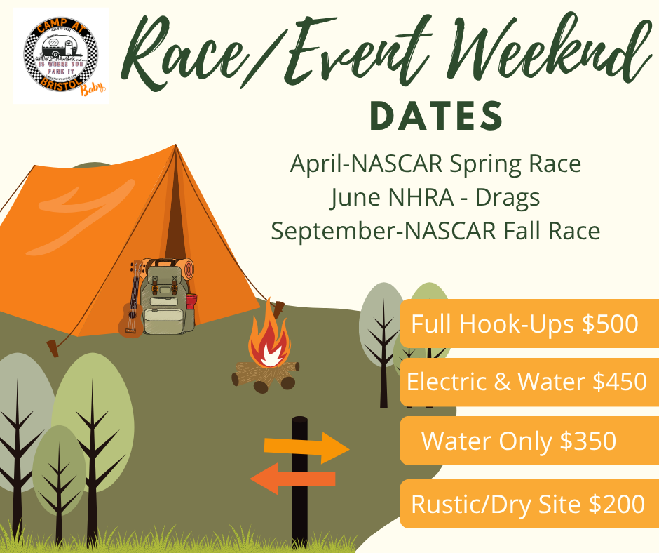 Experience our great campground situated perfectly for race fans of NASCAR and NHRA events at the Bristol Speedway.